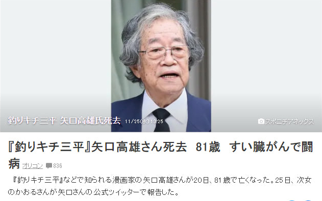 我尊敬的《天才小钓手 – 三平》作者 – 矢口高雄大师,离世了。